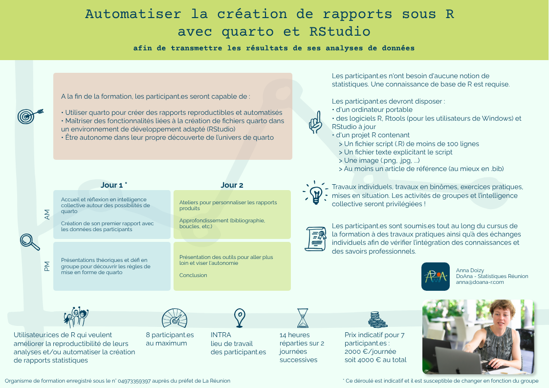 Forme-toi avec ton équipe à utiliser R, à acquérir des méthodes de travail reproductibles, à prendre soin du début de vos projets de recherche. J’utilise une pédagogie active pour encourager la coopération d’équipe en partant de votre propre expérience.